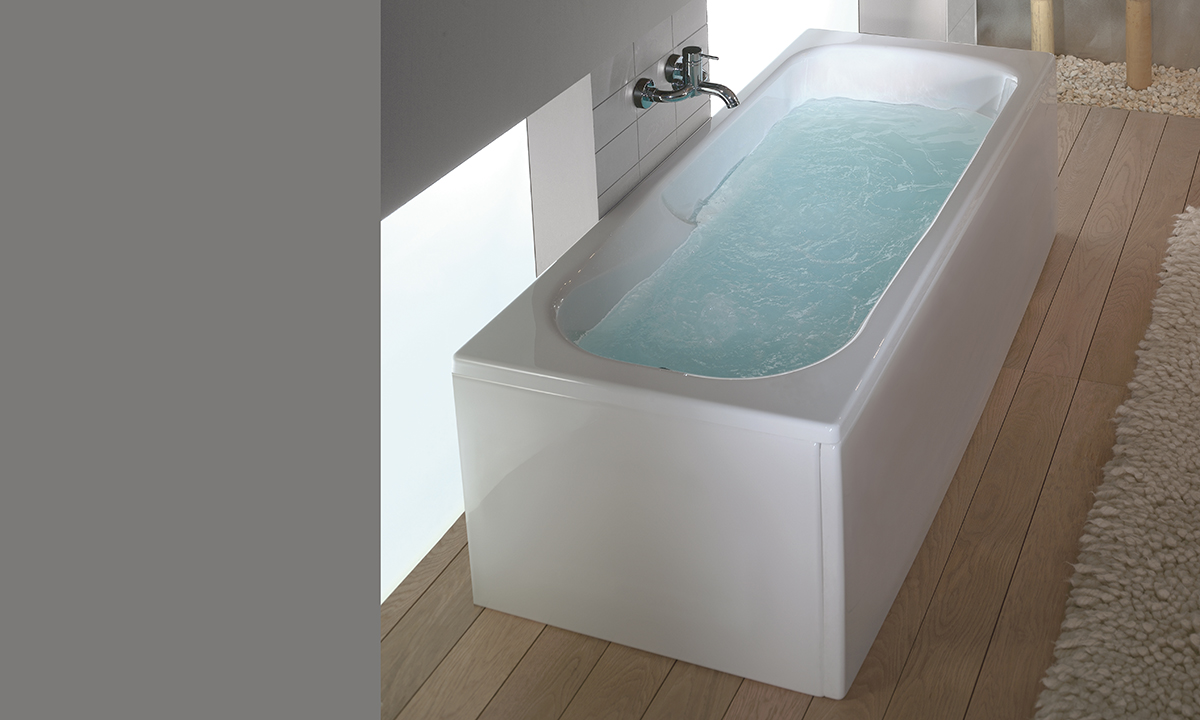 Fabricada en varios tamaños, este modelo cuenta con una versión de grandes dimensiones (180x80) con desagüe centrado, que otorga a la bañera dos zonas confortables de respaldo para disfrutar de un agradable baño en pareja.
