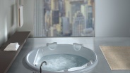 La bañera OMEGA circular está pensada y diseñada para la comodidad. Sus amplias dimensiones y sus líneas suaves invitan al descanso y disfrute de los sentidos. La bañera OMEGA es ideal para que dos personas compartan el baño confortablemente.