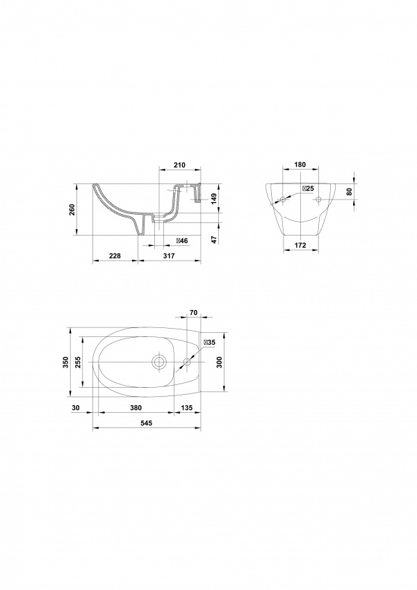 Bidé de 54,5 x 35 cm. / 15 kg. / 24 unidades palet. Posibilidad de instalación con soporte mural.