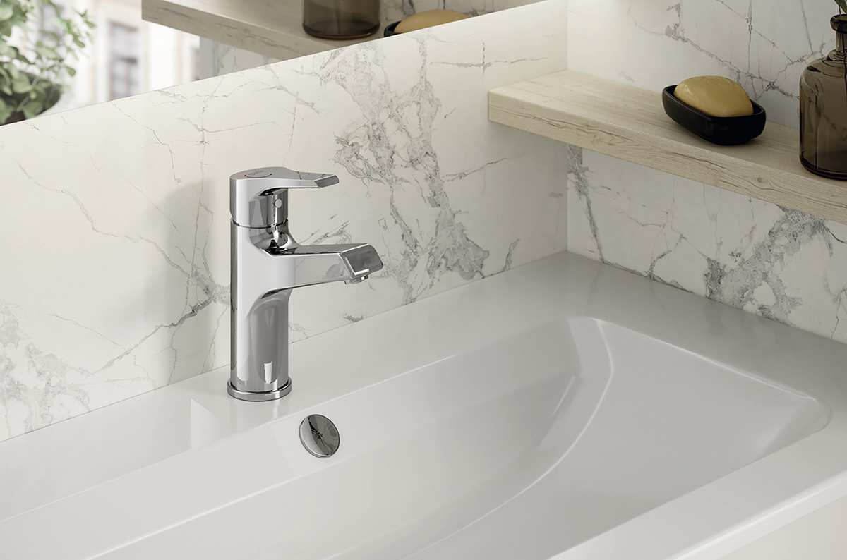 Monomando de lavabo con apertura en frío. Incorpora un limitador de caudal a 5 l/min. Enlaces de alimentación flexible de 3/8”. Instalación con válvula up-down.
