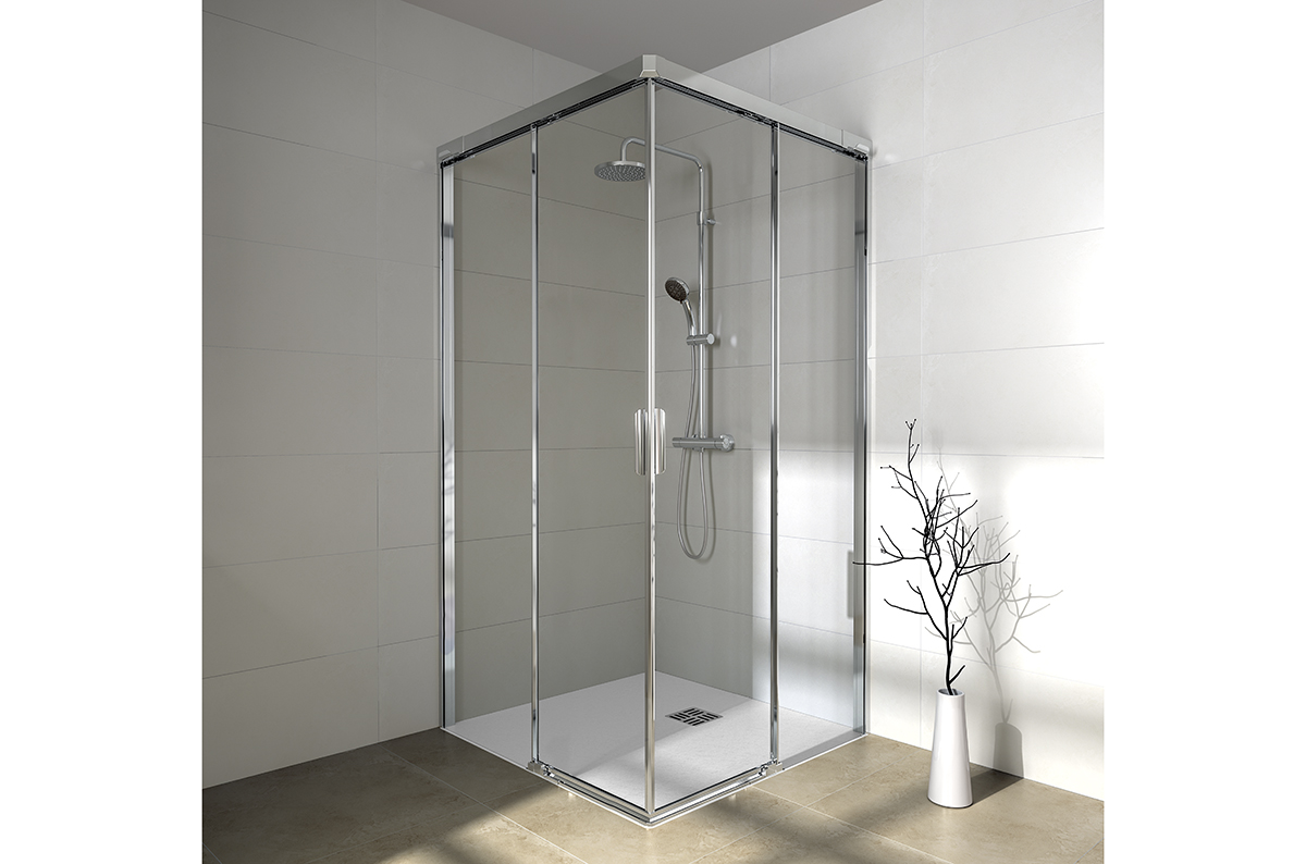Mampara lateral Klevan V de 70 cm. (1 segmento fijo + 1 puerta corredera). Instalación entre 2 paredes. Mampara con entrada por el vértice. Para platos cuadrados.