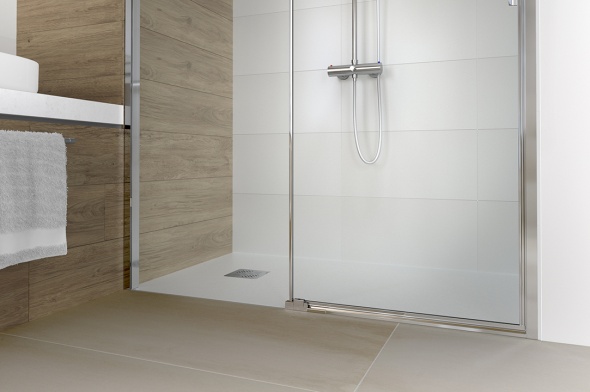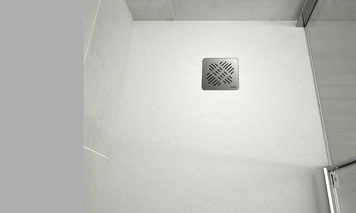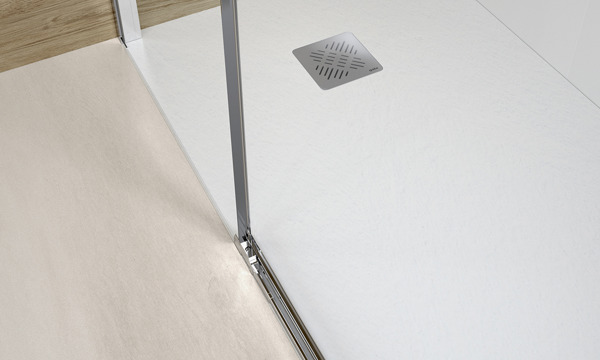 Es una solución limpia, rígida y estéticamente atractiva, que permite una continuidad del plato de ducha al mismo nivel que el suelo y una mayor sensación de amplitud en el baño.