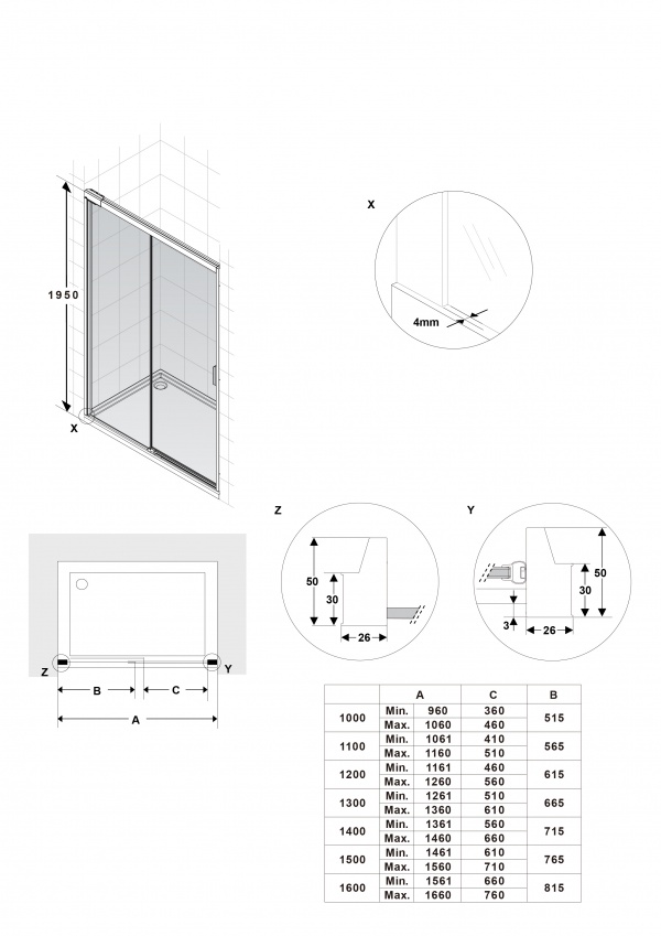 Mampara frontal Klevan F de 140 cm. (1 segmento fijo + 1 puerta corredera). Instalación entre 3 paredes. Mampara frontal