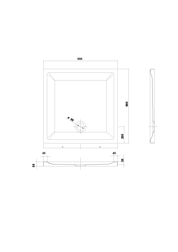 Vita-N 90 x 90 cm. cuadrado 5,5 cm. de altura. Válvula de desagüe de 90 mm no incluida. Acabado negro texturizado. / 10 kg. / 10 unidades palet.